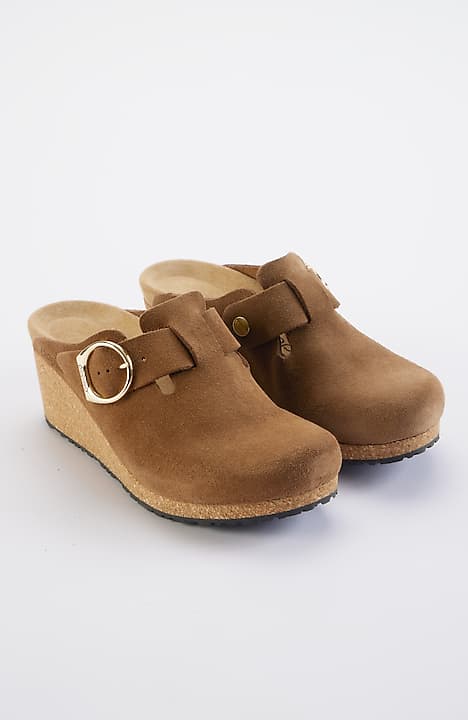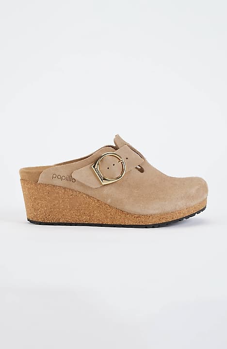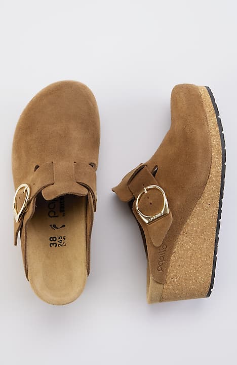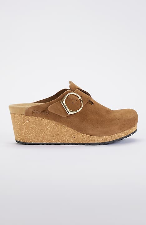 Classic Birkenstock® shoes get their latest update with a featherlight cork heel. Designed with an adjustable buckle, suede footbed, and Birkenstock's signature PU tread, which gives you all-day, lightweight traction.